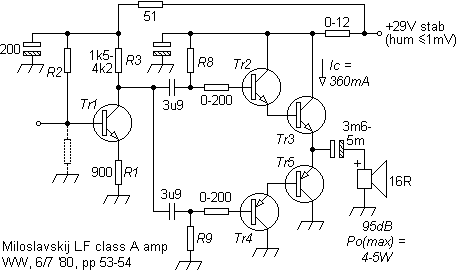 Miloslavskij class A amplifierThese designs, using single-ended and/or push-pull layouts with no overall feedback, were adopted as a basis for a 3-way power amplifier (0.5 to 10W) with passive (phase-linear) filters of 6dB/octave. Intended to drive efficient speakers within sound pressure level peaks of 100 to 108dB in rooms with volumes of 30 to 120 cubic metres, comparable to listening to symphonic music somewhere in the centre of the pits at the fortissimo, the upper frequency limit of such amplifiers may be 20MHz or more. This approach, then, recognises the fact that the maximum undistorted sound output of a speaker occurs long before the rated maximum electrical handling specification.