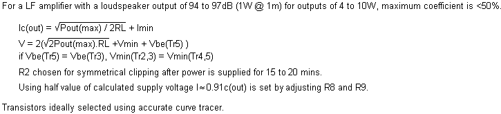 Output transistors - Vce(max) of 120-400V, Ic(max) 8-12A, Pc(max) of 50-120W, fT of 3-20MHz and a current gain (Darlington) of 5-10,000 (output device 60-90). For good symmetry of arms R8 ≈ R9 and βTr3 x βTr2 ≈ βTr4 x βTr5 and preferably βTr3 ≈ βTr5. To reduce instability (10 to 20%) of continuous quiescent current with temperature, R8 and R9 can be PTC thermistors. Maximum temperature of transistor junctions must not exceed 70-80°C.